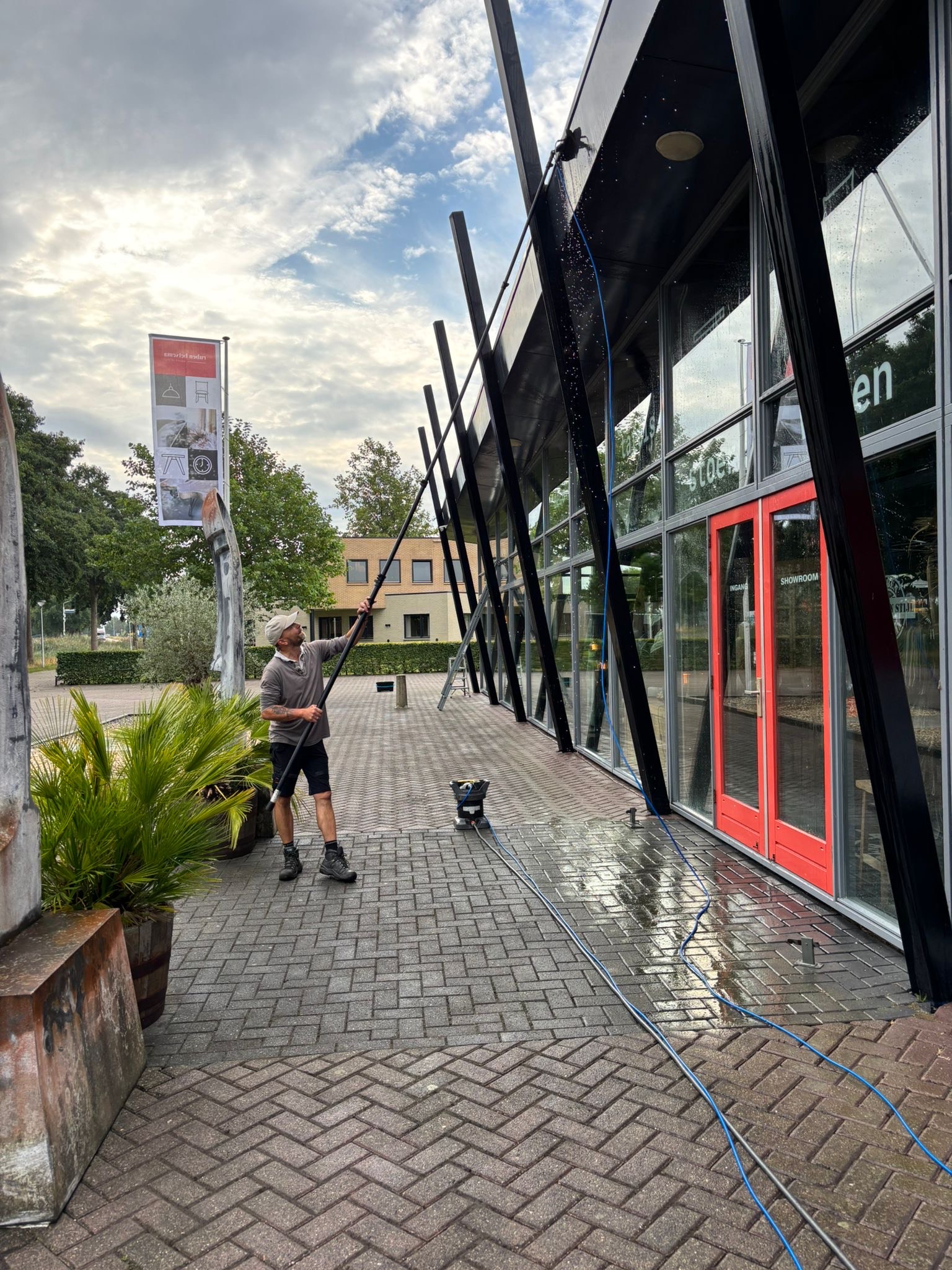 Als het echt niet anders kan zijn wij op de telewash aangewezen. Wij hebben ook met veiligheidsregels te maken. Is het te hoog of is de plek moeilijk bereikbaar, dan komt “ de stok” eraan te pas. Er wordt dan gewassen met kalk en mineraal vrij gefilterd water, waardoor het streeploos opdroogt.